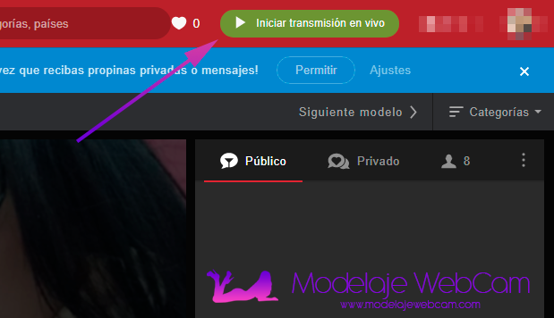 1. Inicia sesión en tu cuenta de Stripchat y ve a la página de transmisión haciendo clic en «Iniciar transmisión en vivo» y luego para ver todas las opciones de tu sala.