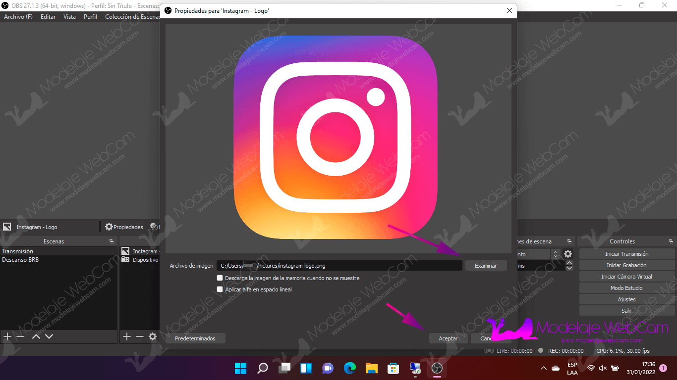 3. Descarga la imagen de Instagram, luego selecciona la imagen del logo y dale «Aceptar».
