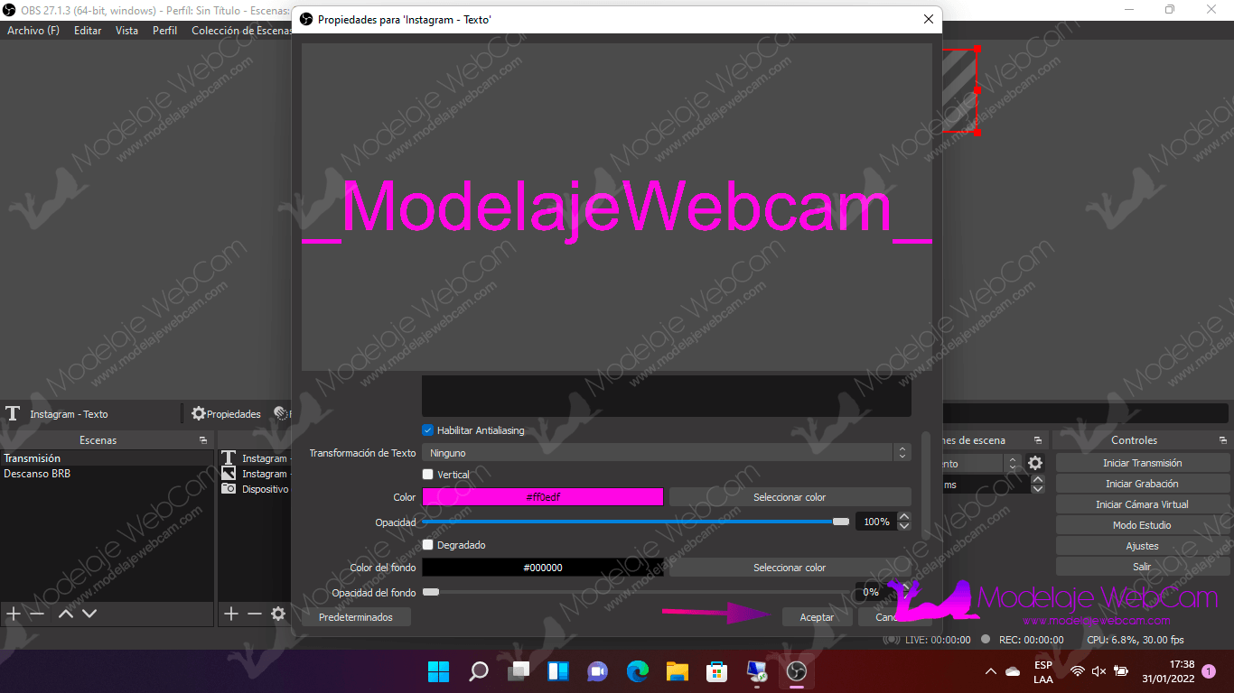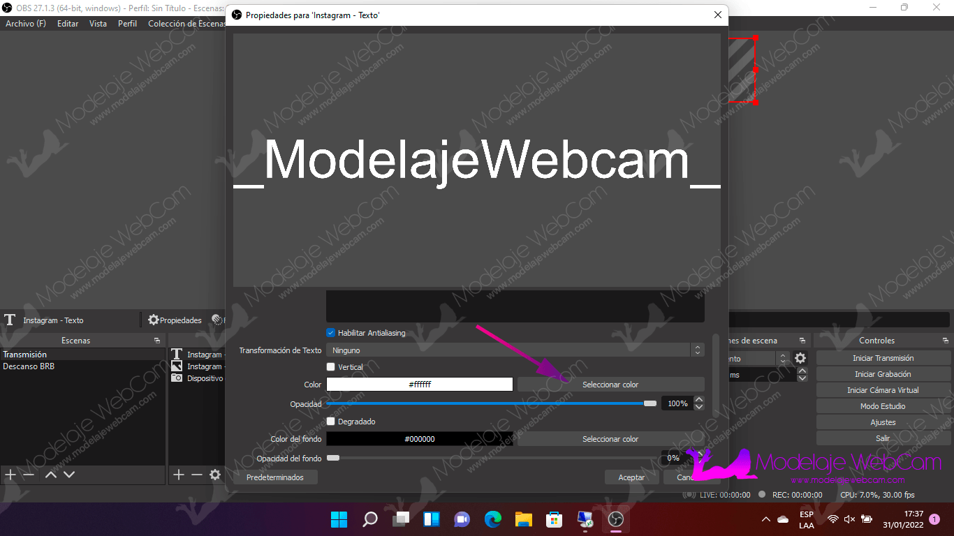 3. Escribe tu usuario de Instagram, en la siguiente imagen escribiré el mío como «_ModelajeWebCam_» y también puedes cambiar el color del texto con la opción «Color» y presionas «Seleccionar color».