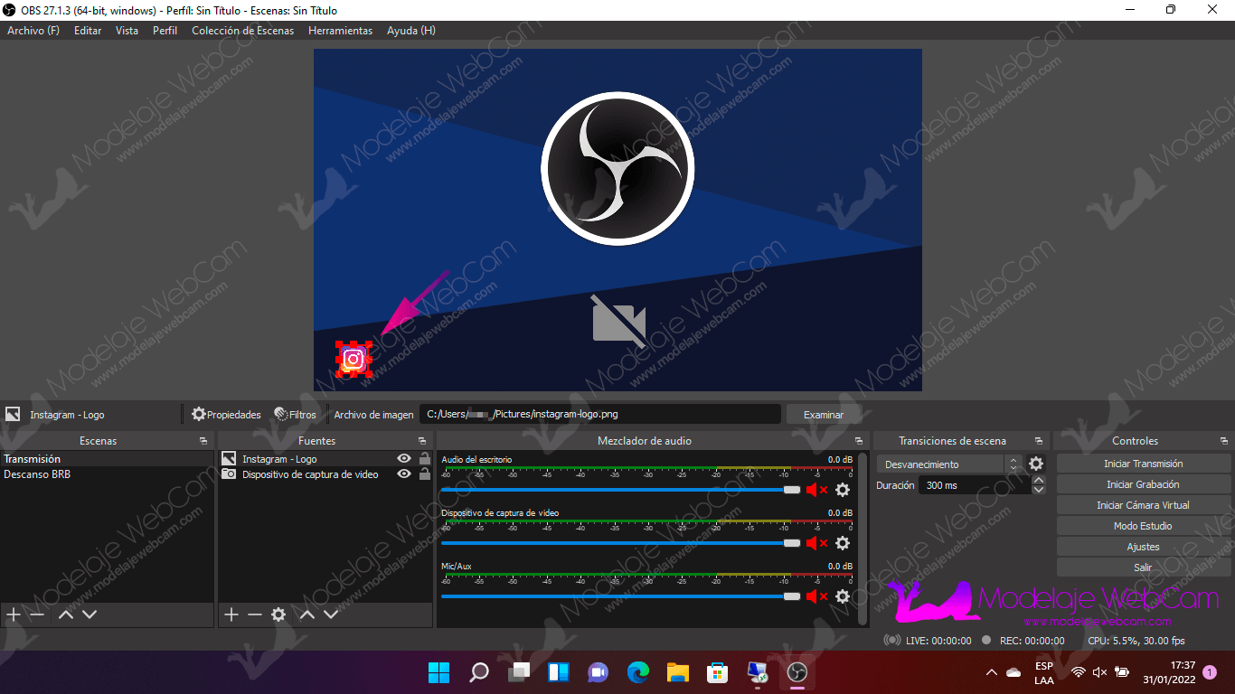 ¿Puedo agregar un efecto de transparencia al logo o texto en OBS?