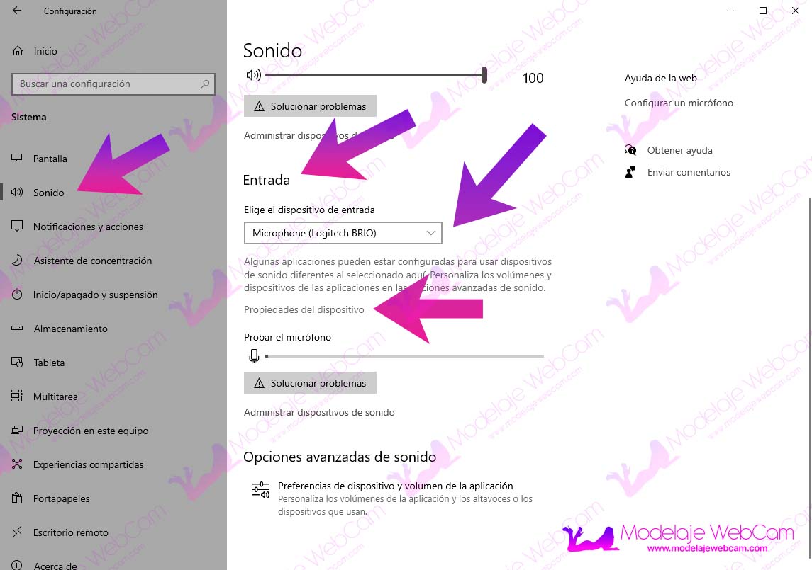 4. En la sección de «Sonido», ve a la sub-sección de «Entrada», selecciona el micrófono que deseas levantar el volumen y haz clic en «Propiedades del dispositivo».