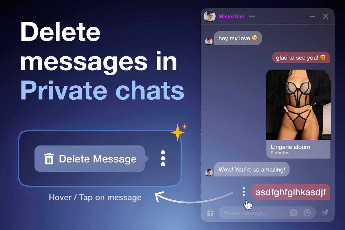 Una nueva característica ha añadido la plataforma «Stripchat» en su sistema de chat privado o PM. Ahora pueden eliminar sus mensajes del chat privado en caso se hayan equivocado de mensaje por dar su opinión o comentario. Esta característica esta tanto disponible para las modelos webcam como para los usuarios en las conversaciones privadas.
