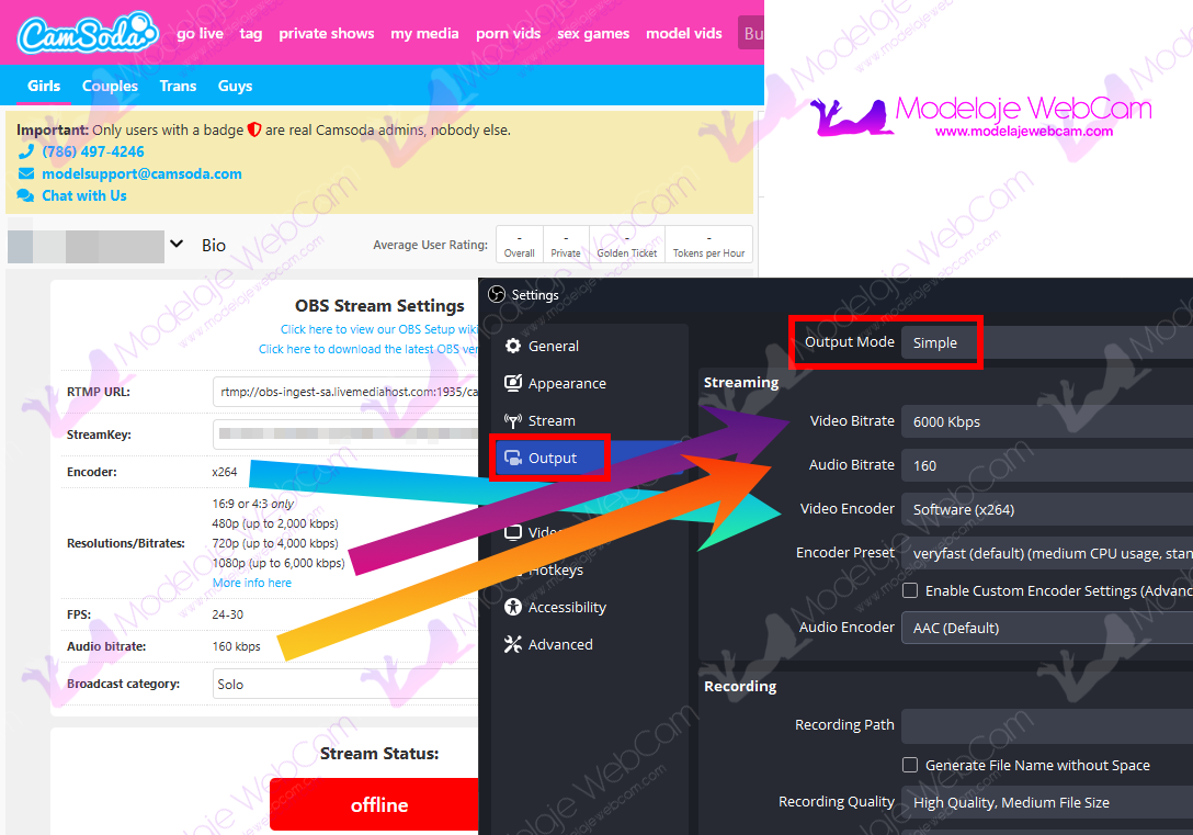 2. CamSoda te mostrará una página que contiene una lista de parámetros para configurar con OBS como la dirección RTMP para transmitir, su clave de acceso, el codificador, los bitrates de video para cada resolución, los FPS adecuados y el bitrate para el audio.