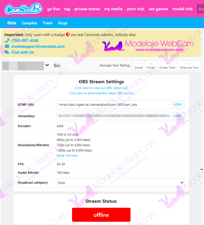 NOTA: No compartas dicha clave que te otorga CamSoda con otras personas. Si alguien tiene acceso a a tu clave, la persona puede transmitir en tu sala con su cámara web.
