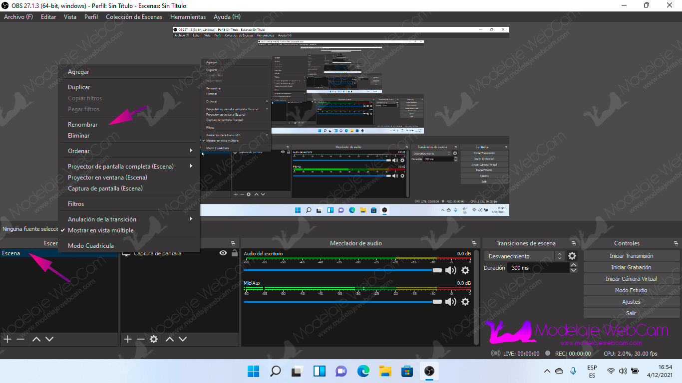 - Para cambiar el nombre a la escena, solo debes hacer un clic derecho sobre el nombre de la escena y seleccionar la opción «Renombrar».
