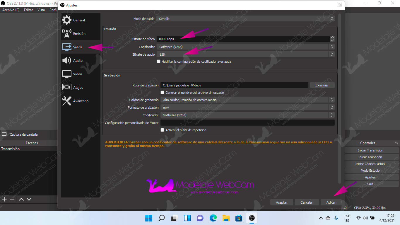 Aquí vamos a establecer la calidad de la transmisión con el «Bitrate» del video y del audio. Se recomienda colocar el bitrate recomendable de acuerdo a la resolución de tu cámara web que puede ser SD, HD, Full HD, 1440p o 4K.