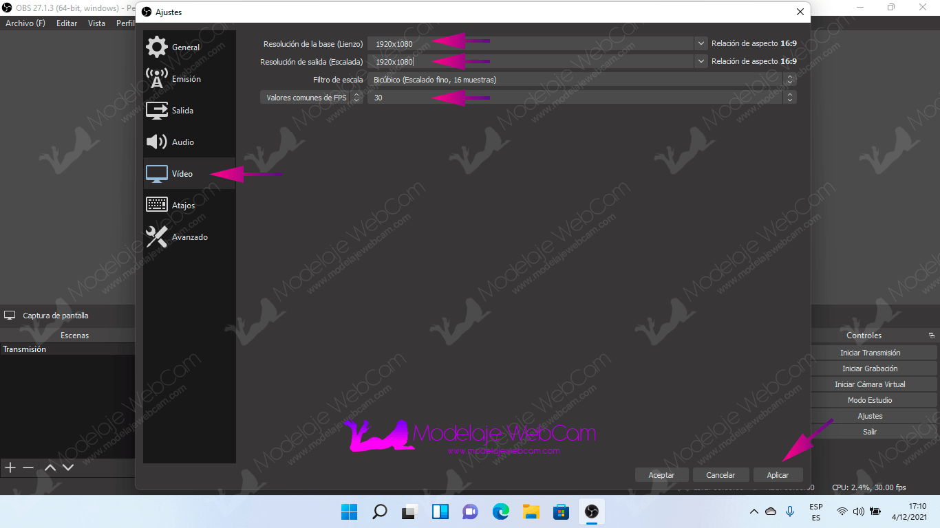 En esta sección se configura la resolución de salida que se recomienda colocar la resolución de la cámara web. En «Resolución de la base» y «Resolución de salida» coloca la resolución HD (1280×720) o Full HD (1920×1080). Una vez configurado correctamente, dale clic en «Aplicar» o «Aceptar».