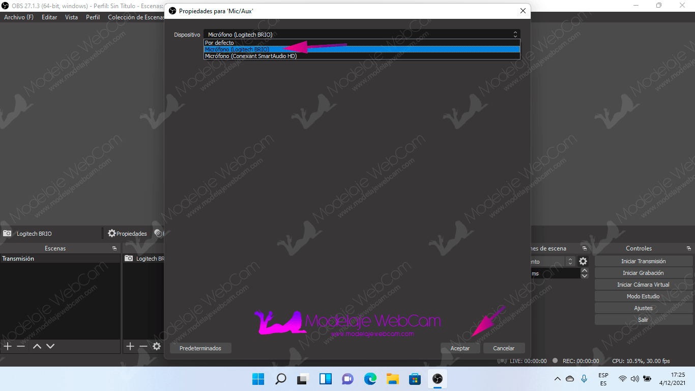 Verificamos si OBS ha seleccionado el micrófono es de la cámara Logitech como se muestra en la siguiente imagen. Si todo está correcto, presionamos «Aceptar».