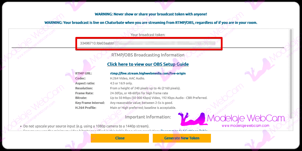 En esta pestaña o ficha vamos a colocar el código único que nos brinda Chaturbate para transmitir desde otras aplicaciones de terceros como OBS. Este código de transmisión no lo debes compartir con nadie y sólo tú debes tener acceso. Si algún otro usuario llegara a tener acceso a tu código, token o clave de transmisión de Chaturbate, puede transmitir usando tu canal de Chaturbate.