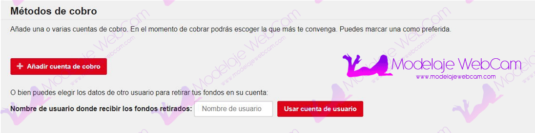 NOTA: Ten en cuenta que las cuentas de modelos que estén asociados a otro usuario en su «Método de cobro», no podrán solicitar pagos, solo podrán transferir todas sus monedas a la cuenta vinculada (Cuenta del studio).