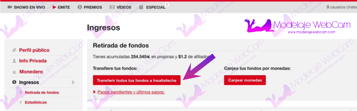 Amateur.tv - Transferir fondos a cuenta de studio