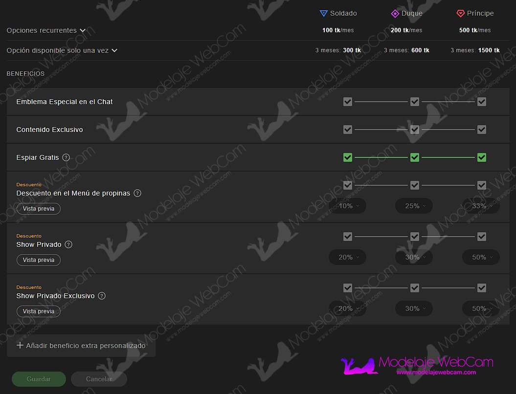 Además, la modelo puede establecer otros beneficios personalizados con descuento como por ejemplo: Snapchat, Fotos, videos, etc.