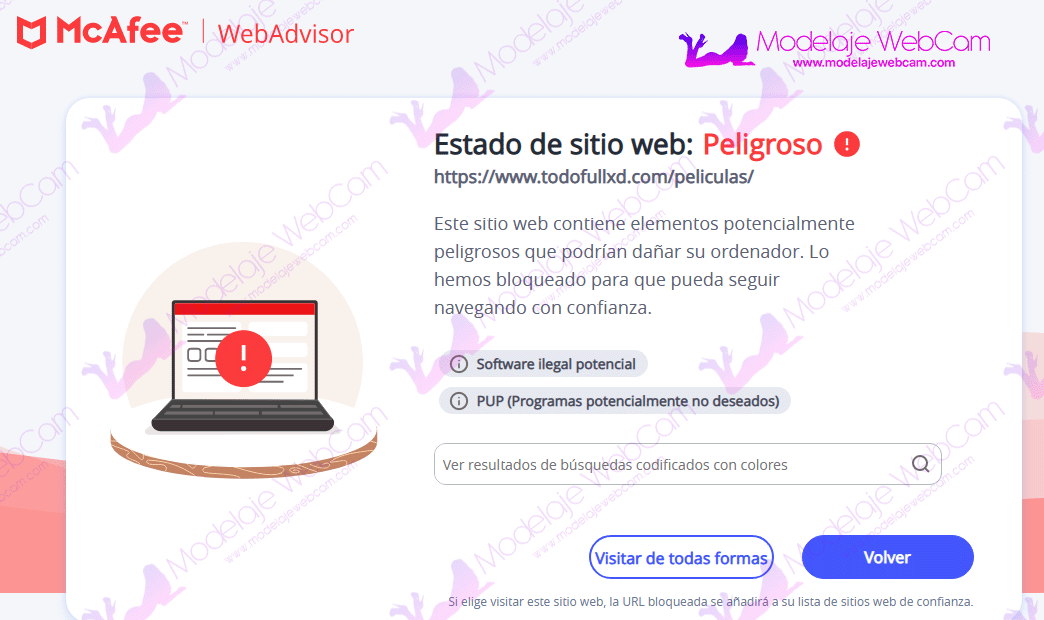 NOTA: En caso quiera visitar una pagina no recomendado por McAfee WebAdvisor, este le mostrará un aviso que la página podría contener elementos potencialmente peligrosos que pueden dañar el equipo.