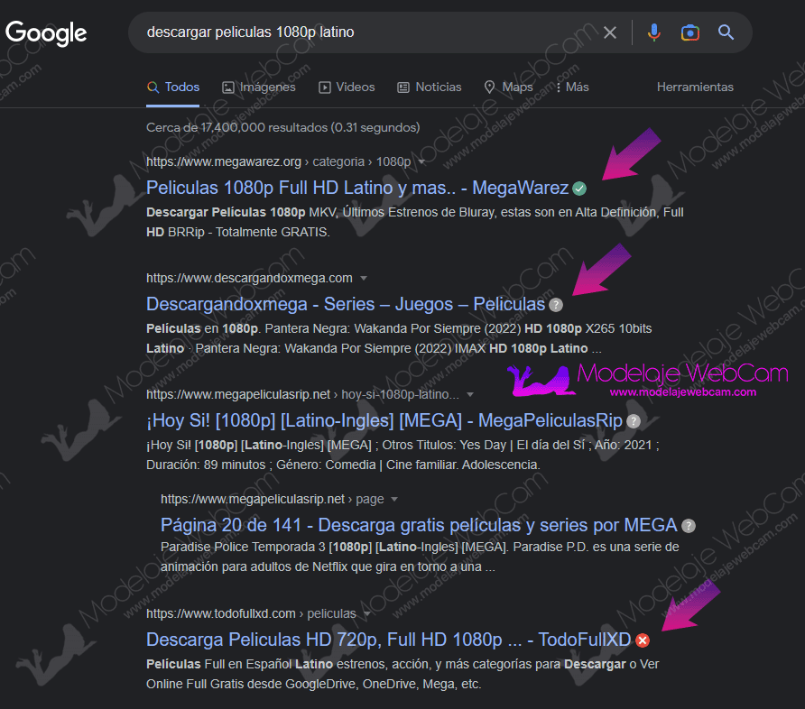 Un ejemplo de lo anteriormente mecionado es cuando se trata de «buscar programas o peliculas piratas«. Estos sitios webs están llenos de publicidad engañosa, muchos botones falsos de descarga para tratar de instalar aplicaciones maliciosas e infectar tu equipo.