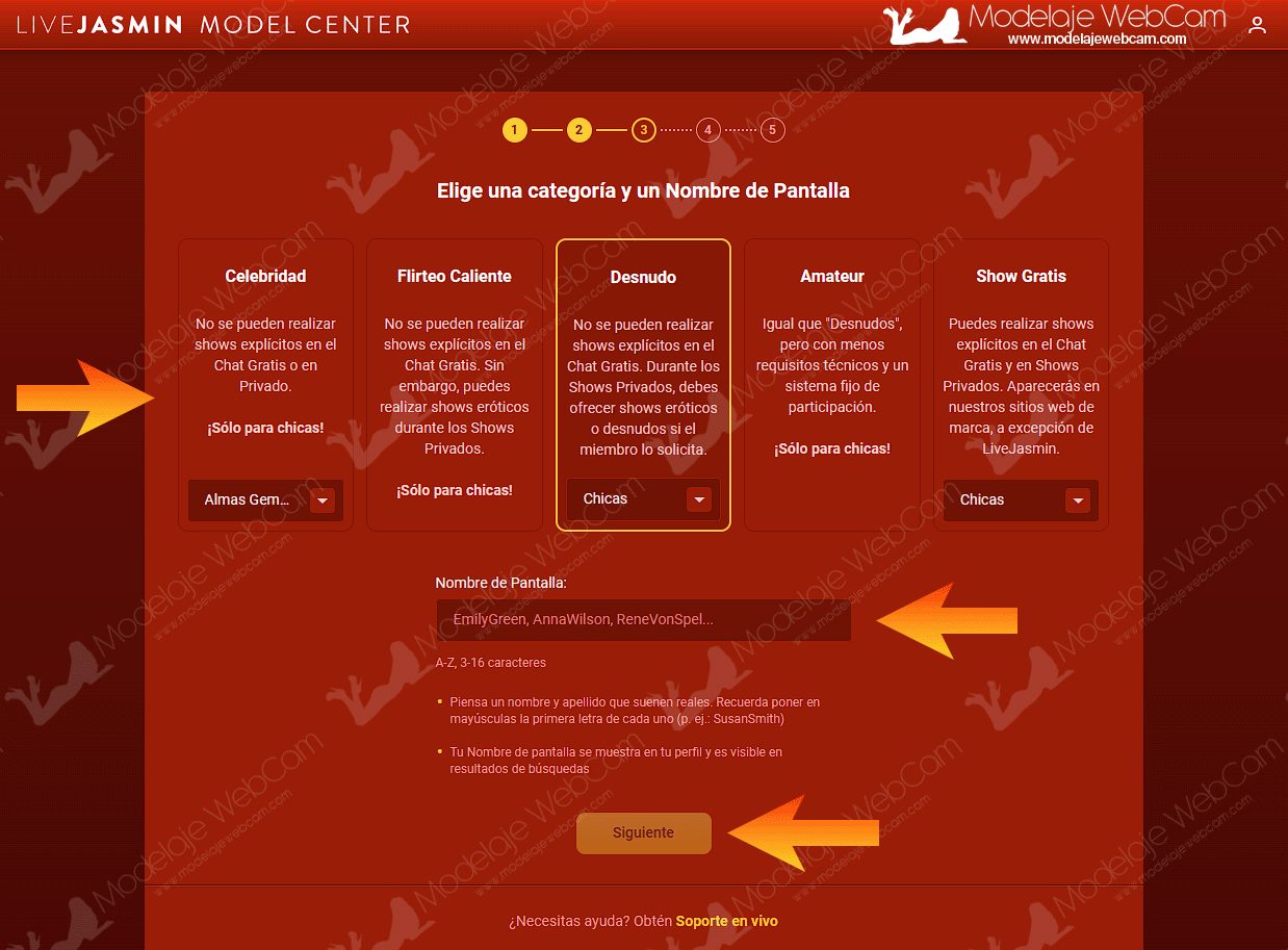 NOTA: En este paso, es importante seleccionar la categoría correcta de lo que te vas a dedicar a transmitir en LiveJasmin para no violar sus reglas. En caso selecciones la categoría incorrecta, la plataforma te asignará a la categoría adecuada.