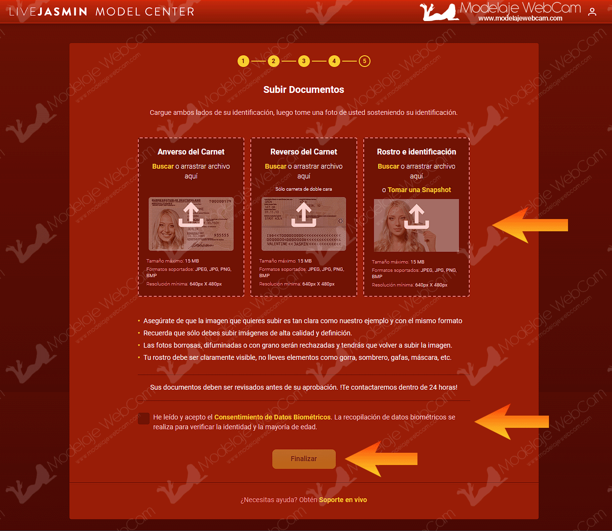 - Aceptar los el Acuerdo de Servicios, Datos Sensibles y políticas de Cookies para Modelos/Estudios.