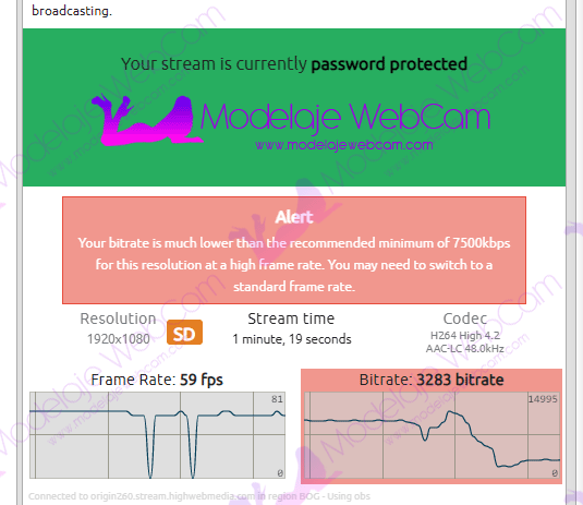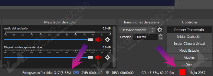 Significa que tu transmisión tiene problemas y los usuarios ven tu show con pausas. Las causas que puedan salir en color rojo se deben a que no tienes la velocidad de subida recomendada, otra modelo está transmitiendo con tu Internet o hay un alto bitrate de video que requiere mucha velocidad de subida. También verás que aumenta los fotogramas perdidos y el porcentaje, avisandote de los congelamientos que ha sufrido desde el inicio de tu transmisión.