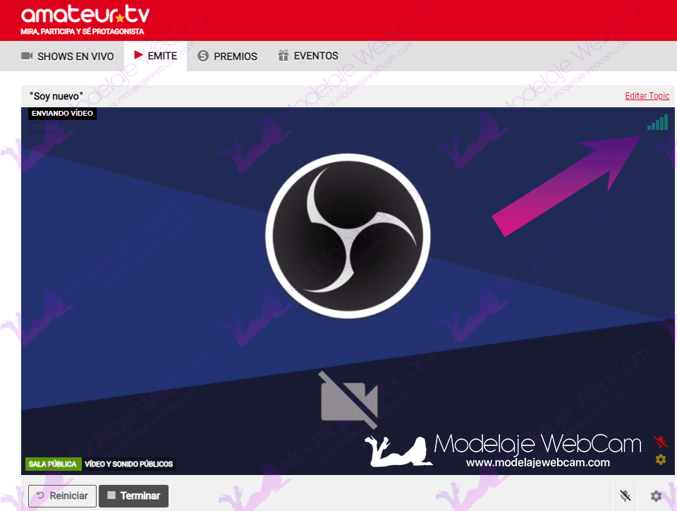 Otras plataformas como Amateur.tv también tienen su indicador de calidad, este se encuentra en la parte superior de tu transisión. La imagen es muy similar a la señal de telefonia móvil. Mientras más barras tenga mejor será la señal y menos barra será pésima la señal.
