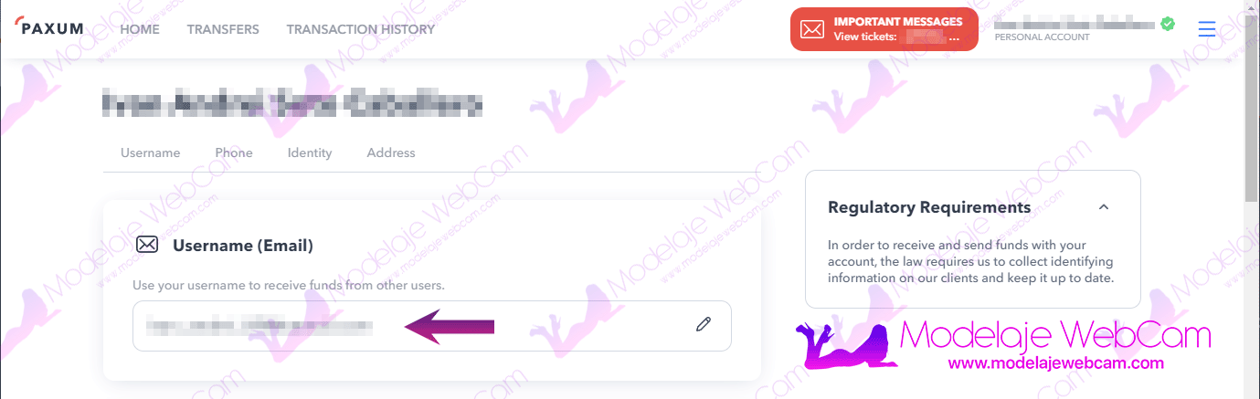 3. En la página de tu perfil encontrarás una opción llamada «Username (Email)» o «Nombre de usuario (Correo electrónico). Ese es el correo que debes colocar en las páginas de varias plataformas que ofrecen el método de Paxum para recibir tu pago.