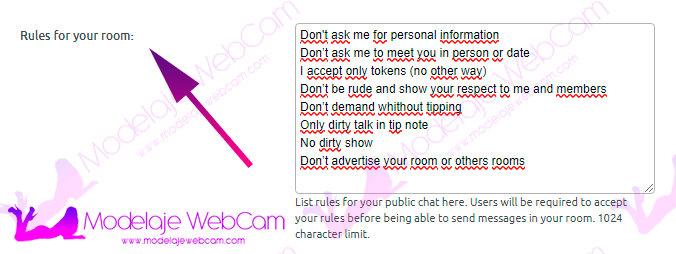 Besides, the model can also add her rules through a design for her Chaturbate profile. There are also bots that every so often display a message with the model’s rules, but it’s a bit annoying in my opinion. With the new option that allows the model to add the rules in the Chaturbate chat, it is only necessary to show 1 time before using the chat.