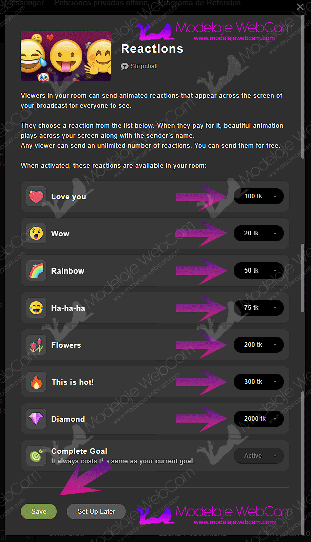 4. Luego, se te aparecerá una ventana para configurar el precio de las reacciones. Una vez terminado, dale clic en «Save» (Guardar).