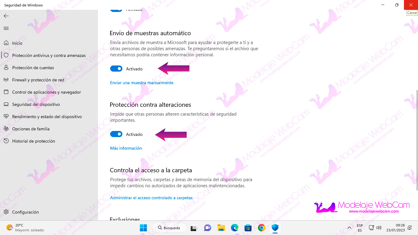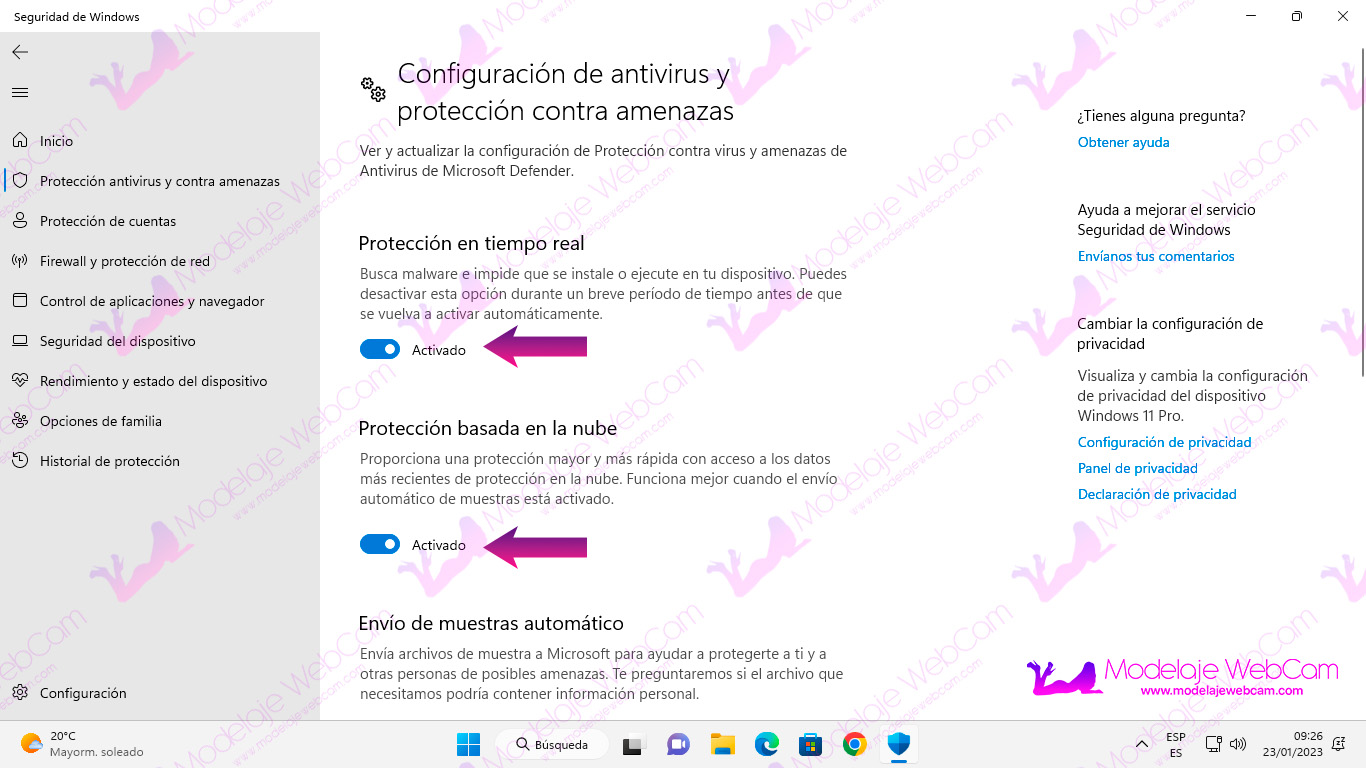 4. Y verifica que la «Protección en tiempo real», «Protección basada en la nube», «Envíos de muestras automático» y «Protección contra alteraciones» estén activadas.